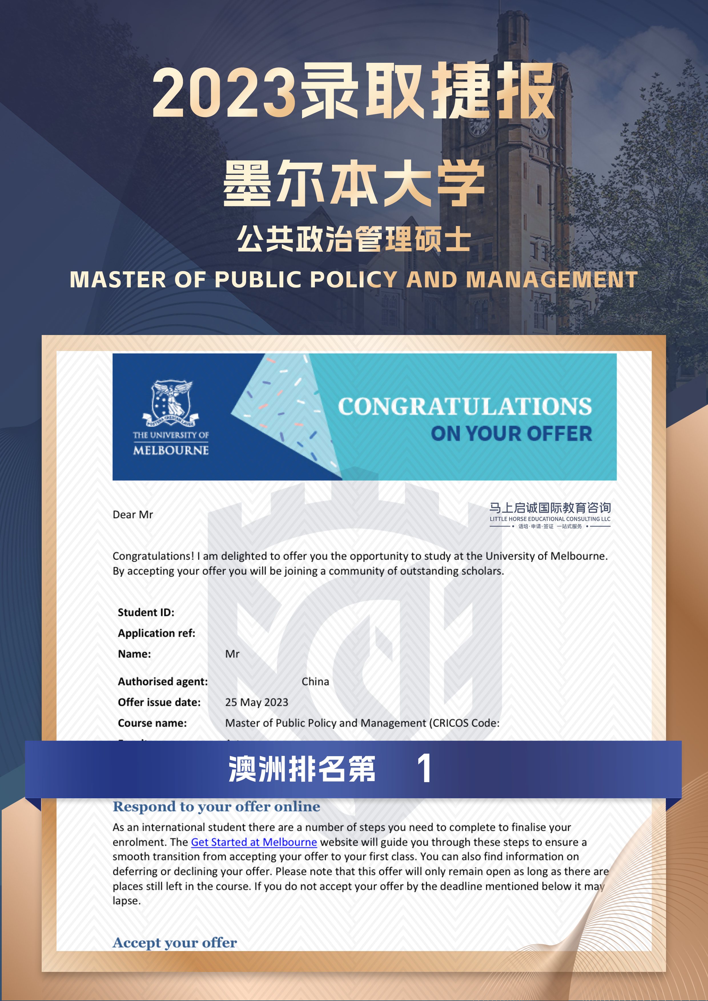 2023墨尔本大学公共政治管理硕士offer